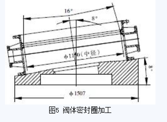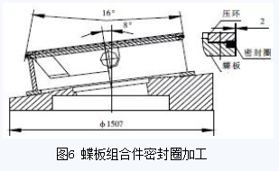 蝶板組合件起密封作用的零件是密封圈,密封圈為斜錐結(jié)構(gòu),其錐頂角為16°,厚度為13.5mm,由5層石棉板及4層不銹鋼板復(fù)合而成(圖6)。密封圈必須與蝶板和壓環(huán)等組裝在一起,加工時(shí)才能防止密封圈夾層中的不銹鋼板及石棉板翹曲變形。根據(jù)其結(jié)構(gòu)特點(diǎn),對蝶板組合件密封圈采用以下加工方法:(1)先在2.5m立車上分別把蝶板和壓環(huán)上的各止口加工到圖紙要求尺寸,外圓不加工;(2)按圖紙要求對壓環(huán)鉆孔,蝶板鉆孔攻絲;(3)壓環(huán)、密封圈和蝶板按圖紙裝配,將蝶板組合件工裝用螺栓緊固在閥體工裝上,然后再將蝶板組合件裝夾其上。立車刀桿旋轉(zhuǎn)8°車壓環(huán)、密封圈和蝶板至磨削尺寸;⑷用同樣厚度鋼板替下密封圈,車壓環(huán)、蝶板各錐面至圖紙尺寸;(5)工裝不動,將壓環(huán)、密封圈、蝶板重新按要求組裝,然后在立車刀架上裝磨頭,對密封圈進(jìn)行磨削處理,使其達(dá)到圖紙?jiān)O(shè)計(jì)粗糙度要求。